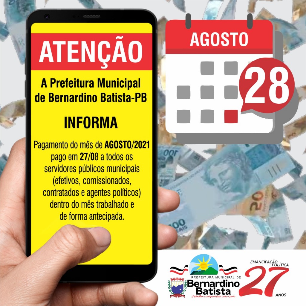 O prefeito de Bernardino Batista, Aldo Andrade confirmou através da secretaria de Finanças do município, o pagamento dos servidores municipais referente ao mês de agosto para esta sexta-feira (27), mantendo a sequência de pagamento em dias, dentro do mês trabalhado e de forma antecipada. Mesmo em meio à pandemia, a gestão municipal continua honrando o compromisso de pagar todos os servidores de forma antecipada e sempre dentro do mês trabalhado.